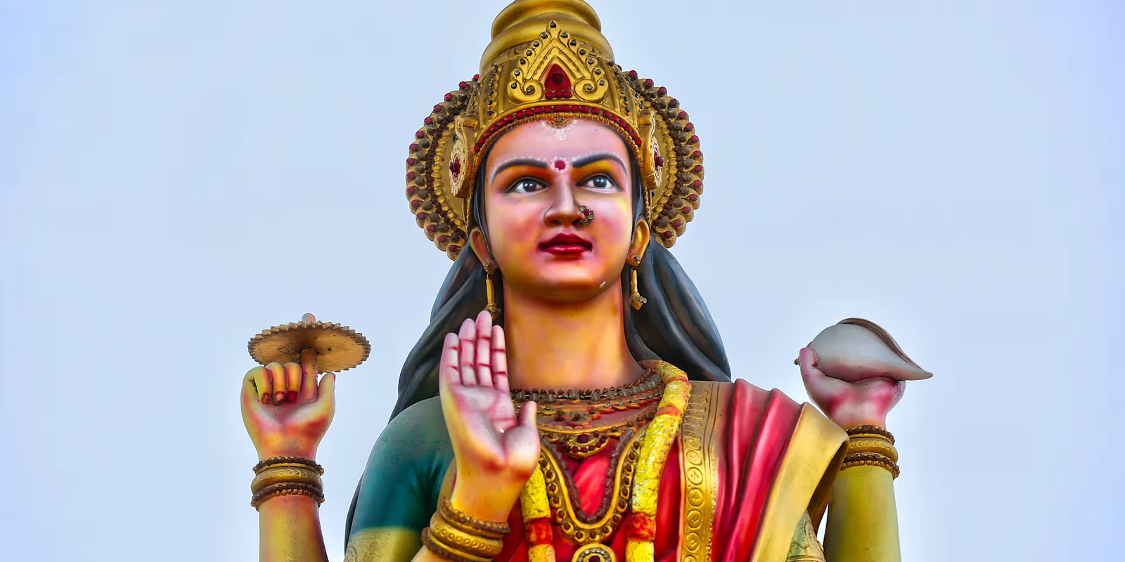 成书于约西元六世纪的《提毗大赞》,意为「女神的颂扬」,被视为印度教女神崇拜的经典之作。书中描绘提毗为唯一且至高无上的女神,她以多种形相显现。最著名的传说之一,描述她化身为「杜尔迦」——这位拥有十八只手臂、骑乘猛虎的美丽战神——拯救世界。正如费所述:「在所有神祇之中,唯有她能击败看似刀枪不入的魔王『玛希沙』。」