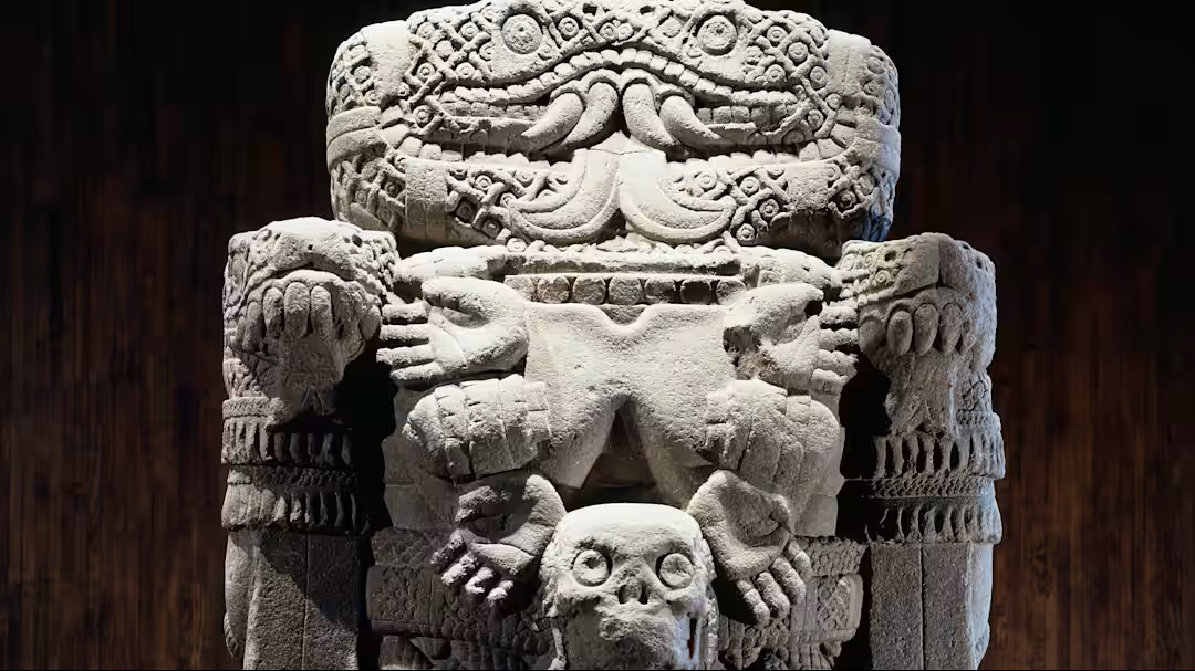 译注:在阿兹特克宇宙观中,生与死并非对立,而是同一循环的两面。科阿特利库象征孕育万物与吞噬万物的「母性宇宙」。蛇象征转化、重生与能量流动。雕像上蛇绕其裙、取代其头,象征生命力量的永续循环。头骨常用以象征死亡的智慧与再生的必要条件,是阿兹特克宗教中常见的象征元素。