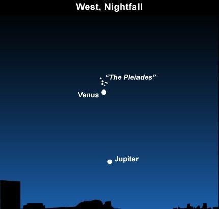 大家可以在四月初日落之後看到金星接近昴宿星团。