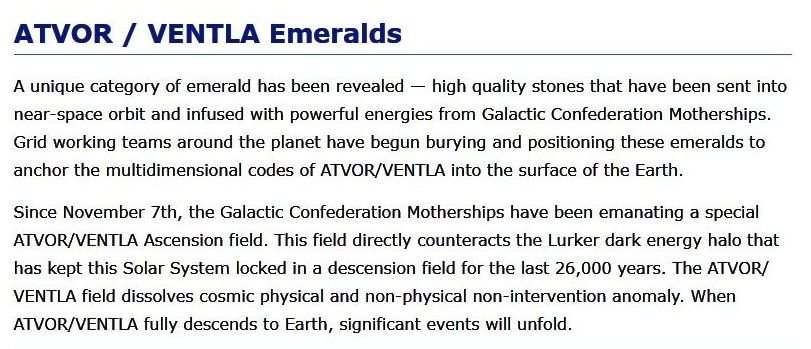 A network of ATVOR/VENTLA emeralds is being strategically positioned within the planetary Light grid. ATVOR/VENTLA emeralds are stones that were put into nearspace and were there infused with the energies of Galactic Confederation motherships. ATVOR/VENTLA emeralds are a cosmic bridge between the New Heaven and the New Earth: