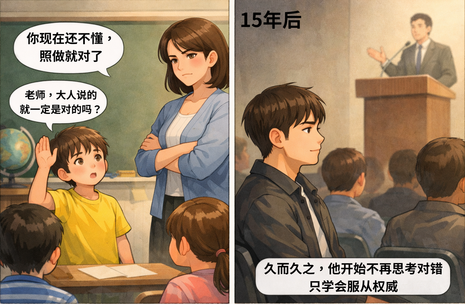 我们从小被灌输的观念,往往是:比我年长的人更懂,比我地位高的人更正确,比我看起来更成功的人更值得服从。久而久之,人们很容易形成一种深层反射:只要遇到某个看起来更强、更厉害、更有气场、更有权威的人,就不自觉的降低自己的判断力,甚至把自己的思考权一并交出去。