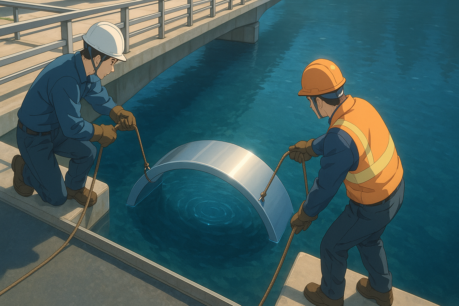 回程的公交车出奇安静,不是无声,而是没有了过去那种急躁。我坐在靠窗,街景像被擦亮。过桥时,桥下的水清得像一片深蓝玻璃;两名穿蓝背心的工作者把一台银白色弧形生态导流器放进水里,装置表面泛起低低的光纹,像在呼吸。