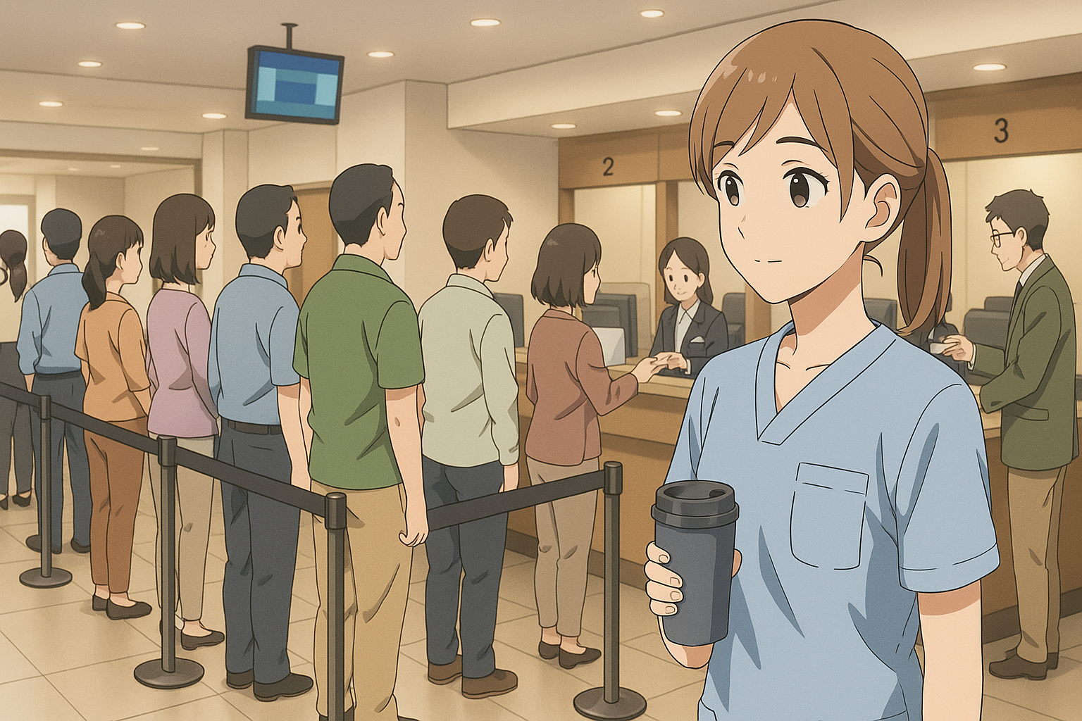 银行前方排起长队,但没有谁在吵闹。取号机上方挂着一块不大的荧幕,轮播几段讯息:「请放心,你的存款安全」、「今日以完成手续为主,细节可后续查询」、「若你身旁的人看起来紧张,请和他说说话」。