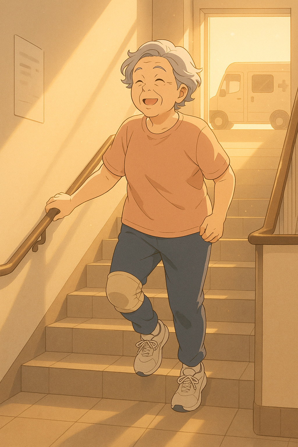 「今天可以跑两趟楼梯了。」她拍拍膝盖,像做成一件大事。